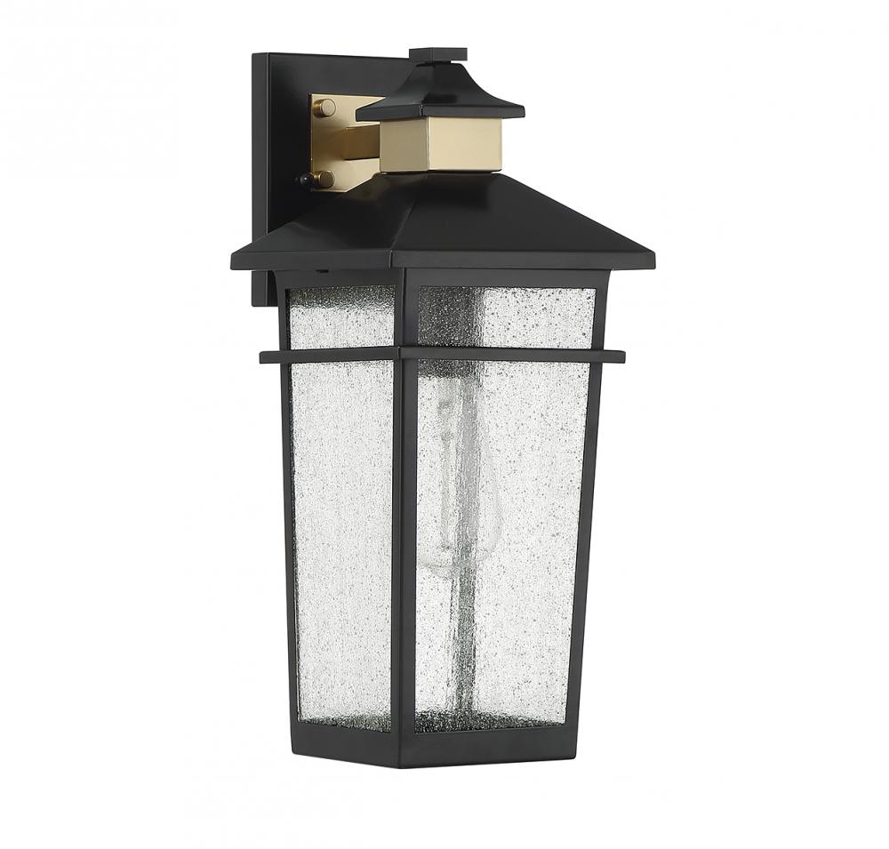 This Savoy House Kingsley 1-light outdoor wall light has a coastal-inspired lantern style with highly fashionable touches. Panes of seedy glass are accentuated by a matte black finish with brass detailing at the backplate and hood. Kingsley is 16.25" in height, 7" in width and extends 8.25" from the wall. It uses 1 standard size bulb with a max of 60 watts (bulb not included).