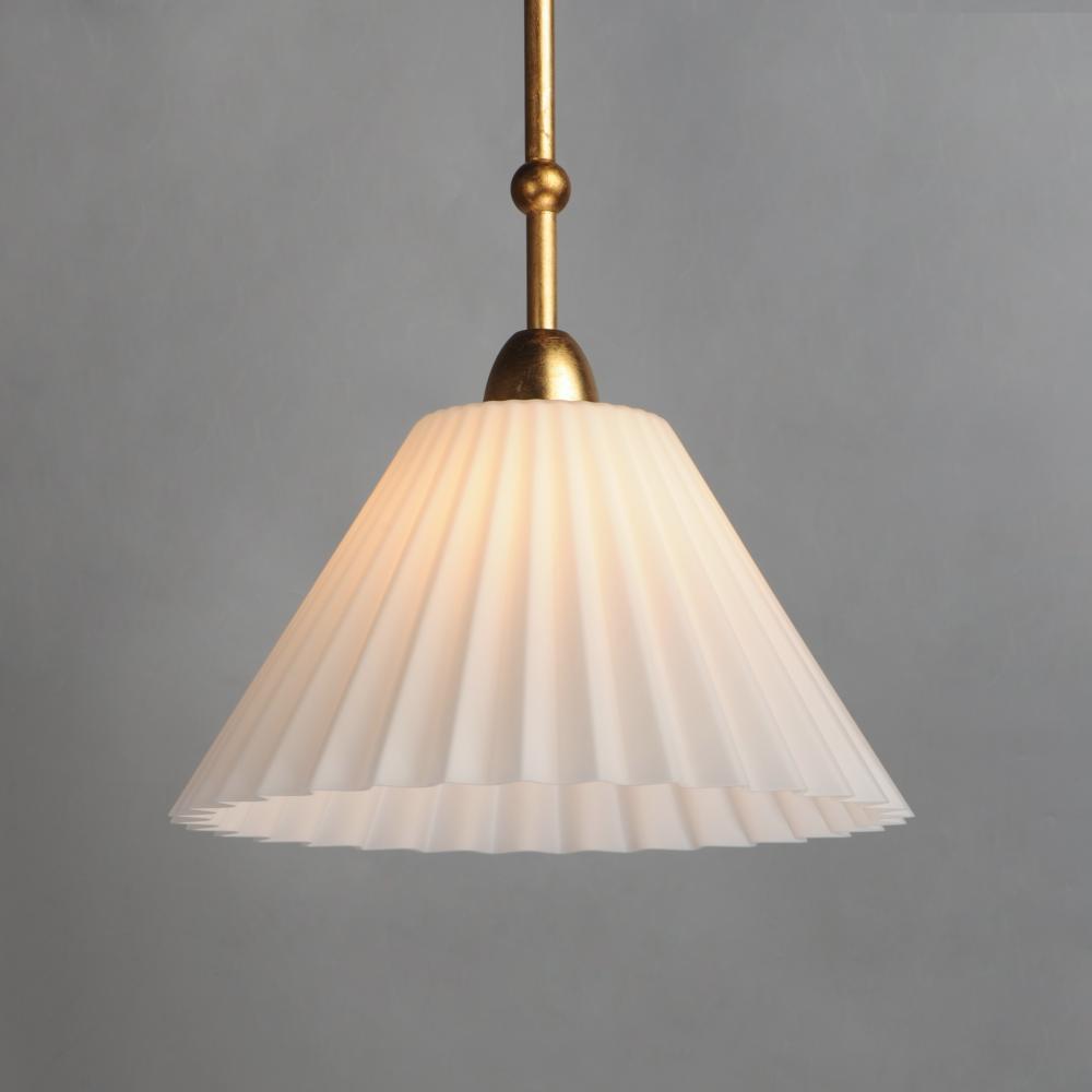 Touches of biophilic details and charming Satin White glass shades modeled on pleated fabric shades create elegant and approachable lighting fixtures. Finished in a rich hand-applied gold leaf, the elongated frame of the chandelier and upturned sconce take