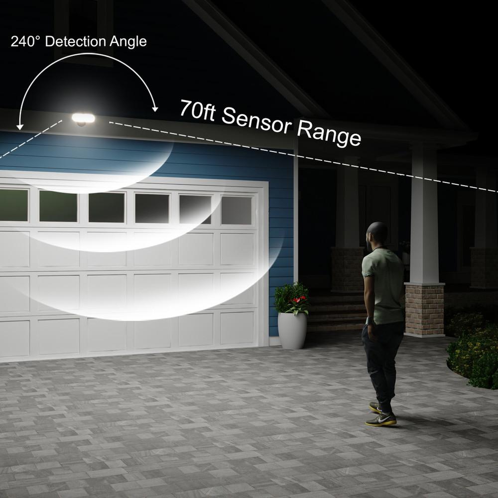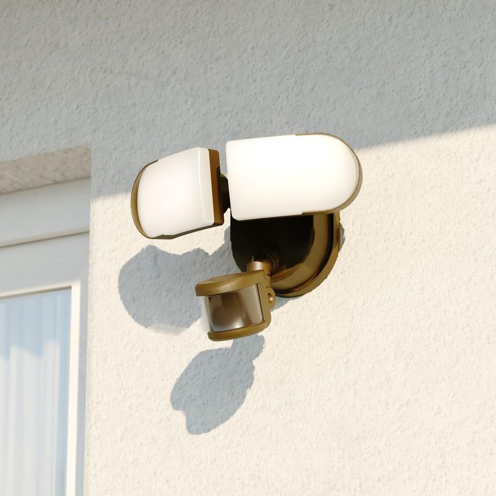 The bronze 2-light Lambda LED outdoor motion sensor security flood light provides the ability to connect multiple security lights into a sync group, so if one in the group detects motion, all will engage with 5000K high level bright light. The modern light heads are fully adjustable and deliver 2,600 lumens to keep your home's exterior brighter at dusk, dimmer with 2700K at night, and instantly bright 5000K when motion is detected. This sync-able dualux security light expands the functionality, safety, and security of your home's outdoor spaces with bright, reliable light when and where it is needed.