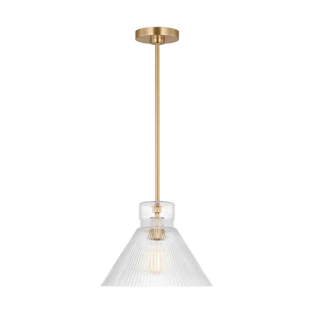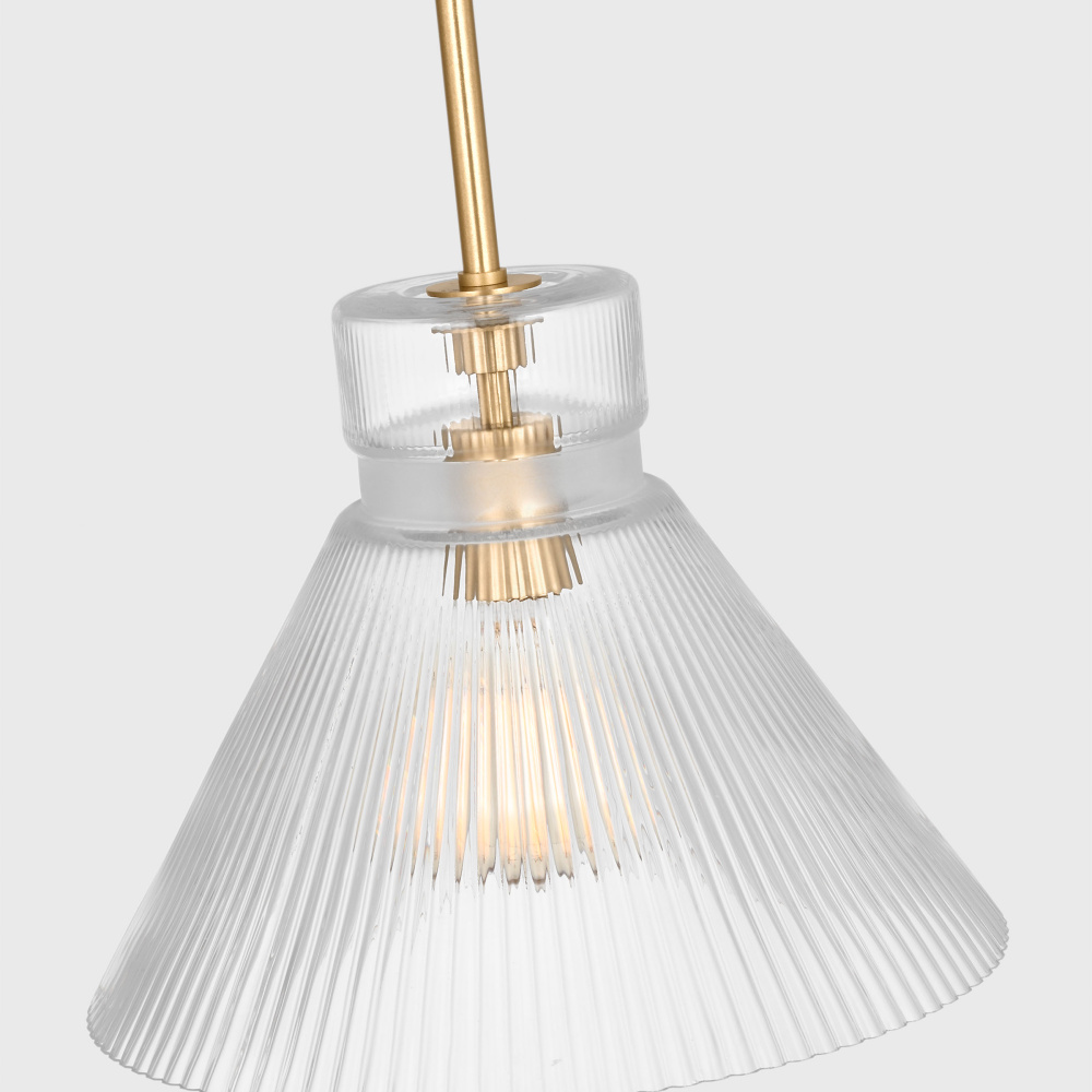 Crafted with Steel in a Satin Brass finish with clear ribbed glass shade