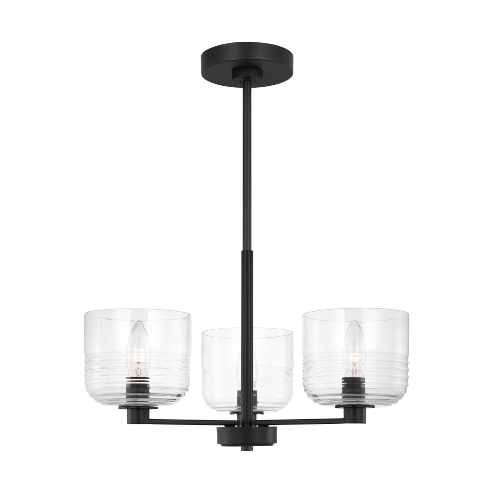 Crafted with Steel in a Midnight Black finish with clear ribbed glass shades