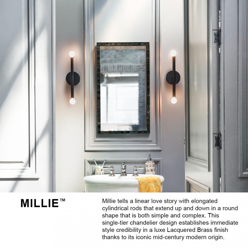 Millie tells a linear love story with elongated cylindrical rods extending outwards, creating a sleek statement that commands attention. This design establishes immediate style credibility thanks to its iconic midcentury modern origin, ensuring visual intrigue in either Black or Lacquered Brass finishes. To complement Millie's chic style, we recommend G16.5 bulbs.