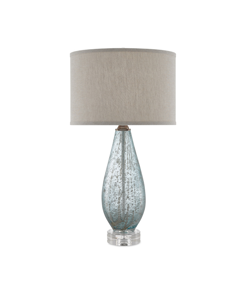 Not unlike the serene beauty of a winter snowstorm seen through a copse of trees, the mouth-blown glass artistry of the Optimist Table Lamp has similar pale blue tones to its speckled glass. The optic crystal base upon which the body perches anchors the lamp. The natural linen shade brings added elemental style to this creation that would bring such loveliness to bedside tables, a special table arranged with elegant accessories or any number of spots in the well-appointed home.