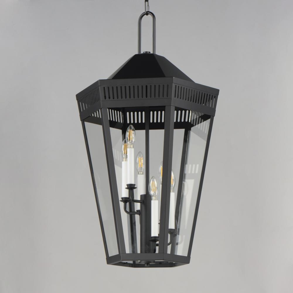 Stately lanterns with perforated filigree along the hood casts a beautiful lighting effect. Finished in Matte Black, the collection is available in multiple sizes as well as flush mount, deck lantern, and two sizes of pendants.