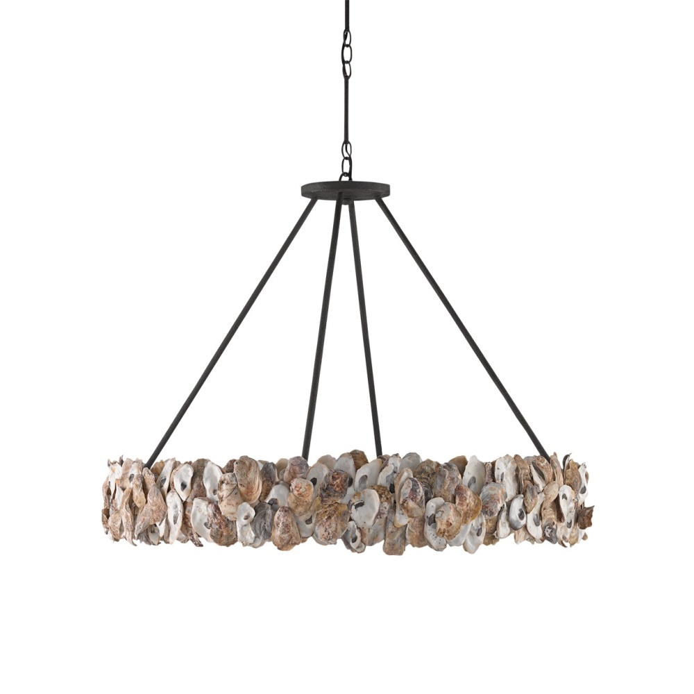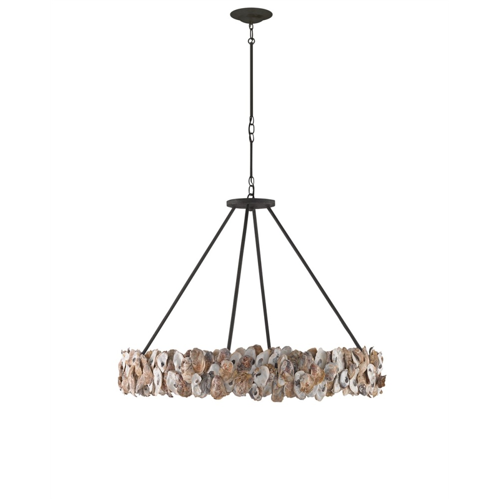 Our Oyster Chandelier with its ring of natural oyster shells bursting with seaside tones and textures has a robust charm. The simplicity and rusticity of the wrought iron frame in a textured bronze finish make this shell chandelier a bold centerpiece. Adjustable from 35.25" to 79.25" with use of included chain/rod kit/cable. If your space calls for a longer drop, additional chain/rods/cable is available for purchase.