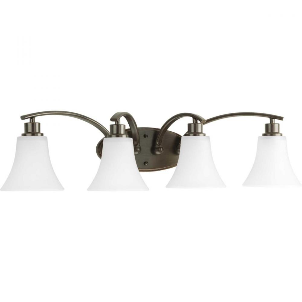 Ideal for a bathroom;Perfect for traditional and transitional style settings;Handsome antique bronze finish;Elegant etched white glass shades;Mount the light fixture facing up or down;Use 4 medium base bulbs that are sold separately (100 W max - LED/CFL/in