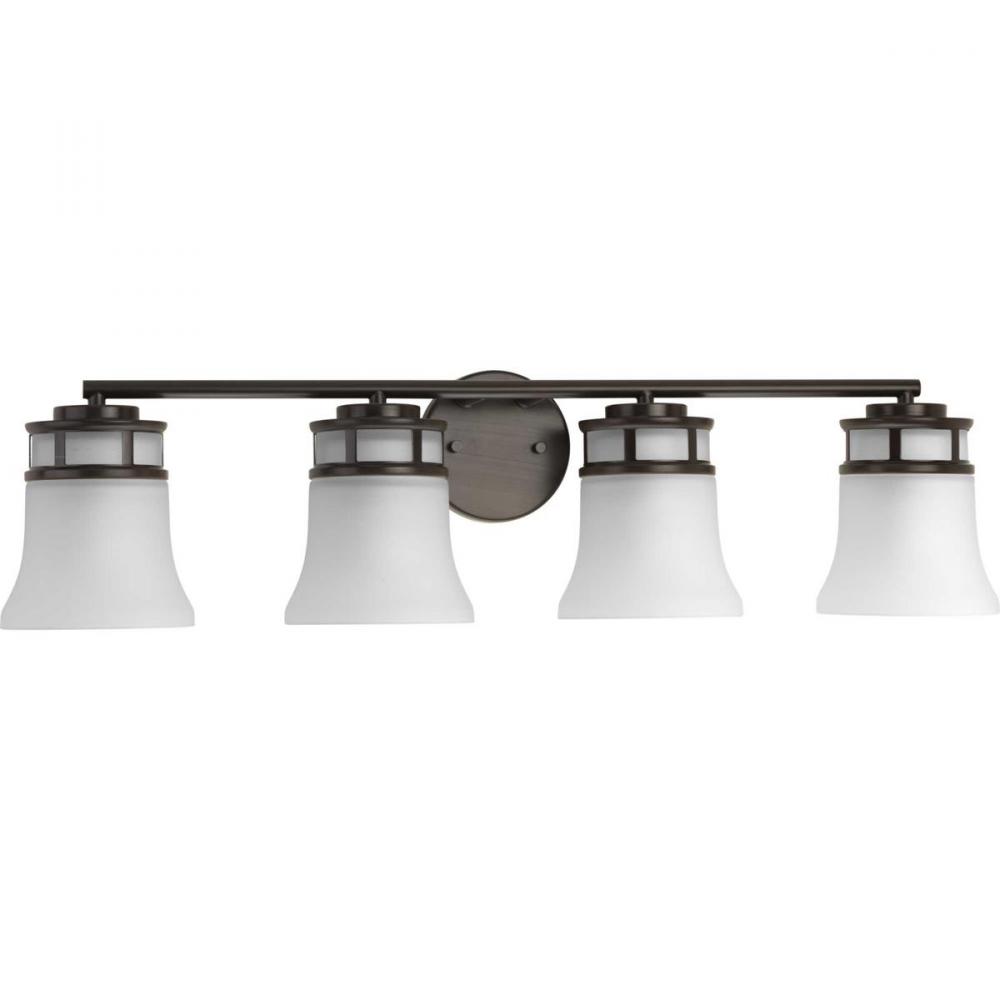 Ideal for a bathroom;Perfect for coastal, craftsman, modern, and modern craftsman style settings;Handsome antique bronze finish;Elegant etched glass shades;Mount the light fixture facing up or down;Use 4 medium base bulbs that are sold separately (100 W ma
