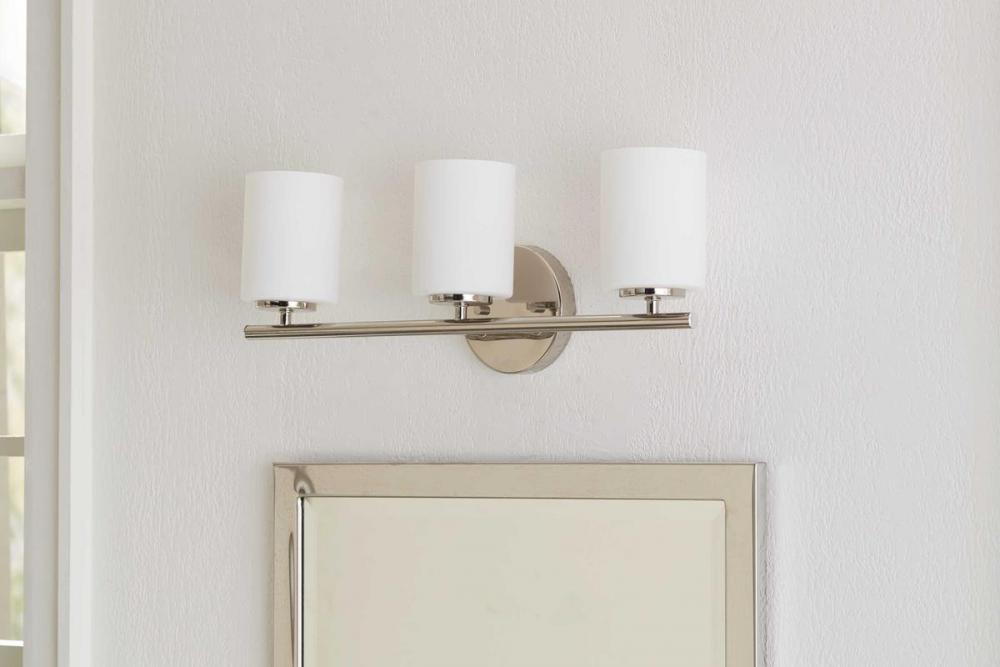 Ideal for a bathroom;Perfect for modern and transitional style settings;Subtle polished nickel finish;Elegant etched painted white glass shades;Mount the light fixture facing up or down;Use 3 medium base bulbs that are sold separately (100 W max - LED/CFL/