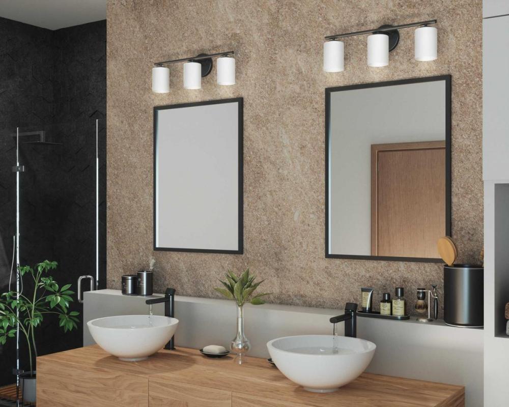 Ideal for a bathroom;Perfect for modern and transitional style settings;Classic textured black finish;Elegant etched glass shades;Mount the light fixture facing up or down;Use 3 medium base bulbs that are sold separately (100 W max - LED/CFL/incandescent);