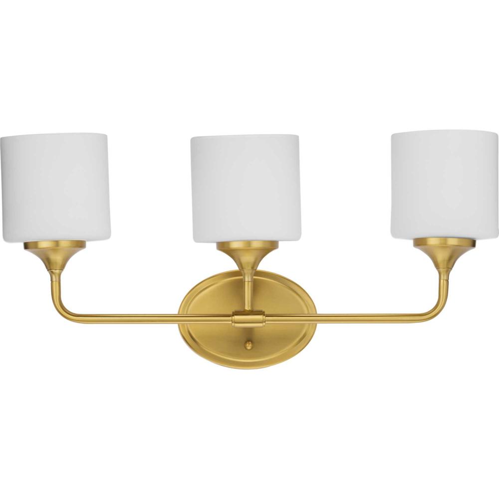 With a youthful, yet timeless flair, the Lynzie Collection brightens your day with its elegant form. Three etched white, oval shaped glass shades are held upright by delicate arms attached to a classic oval backplate coated in a brushed gold finish. Uncluttered and simple lines depict the gracefulness of this bath vanity collection and add visual interest without complexity. Ideal for a bathroom, hallway, or foyer in modern or transitional style settings, this versatile design can be mounted with the glass facing up or down for more design flexibility.
