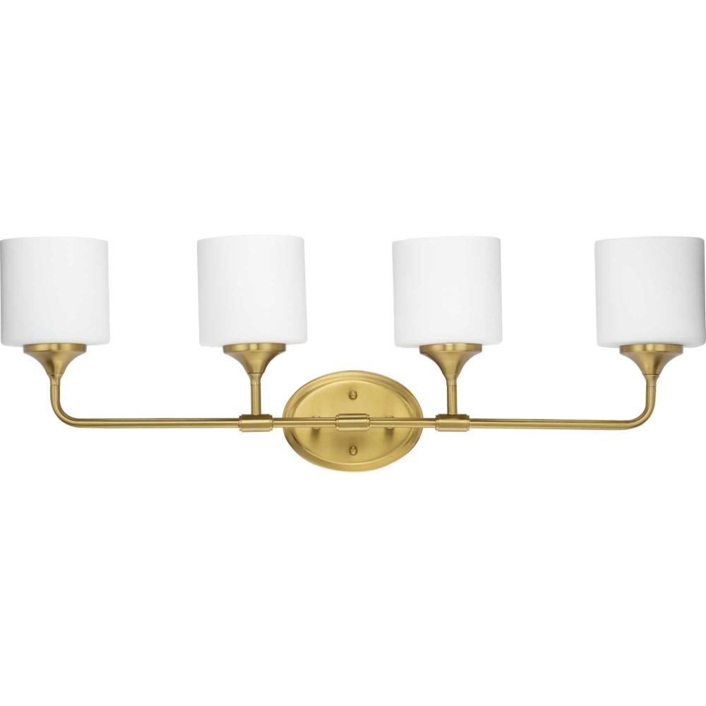 With a youthful, yet timeless flair, the Lynzie Collection brightens your day with its elegant form. Four etched white, oval shaped glass shades are held upright by delicate arms attached to a classic oval backplate coated in a brushed gold finish. Uncluttered and simple lines depict the gracefulness of this bath vanity collection and add visual interest without complexity. Ideal for a bathroom, hallway, or foyer in modern or transitional style settings, this versatile design can be mounted with the glass facing up or down for more design flexibility.