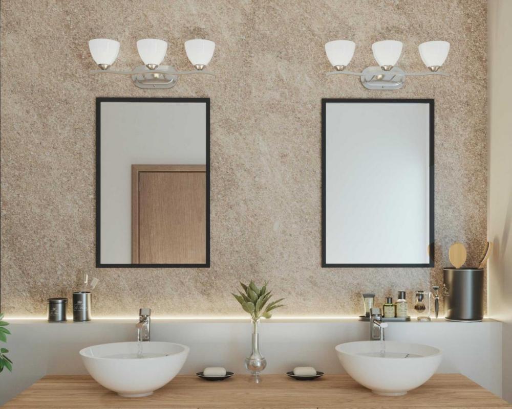 Ideal for a bathroom;Perfect for traditional and transitional style settings;Beautiful brushed nickel finish;Elegant etched glass shades;Mount the light fixture facing up or down;Use 3 medium base bulbs that are sold separately (100 W max - LED/CFL/incande