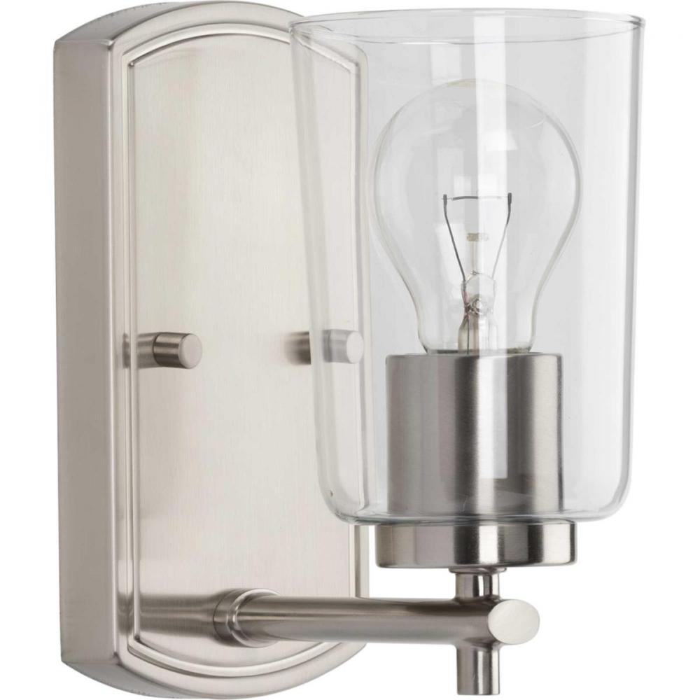Create a haven for relaxation and revival with the Adley one-light bath. This fixture features a Brushed Nickel, curved backplate attached to a simple, clear glass shade. The modern piece is perfect for adding ambient light to bathroom and vanity settings in traditional and transitional interiors.