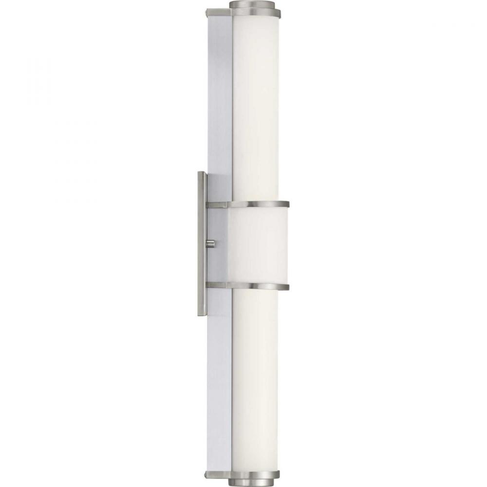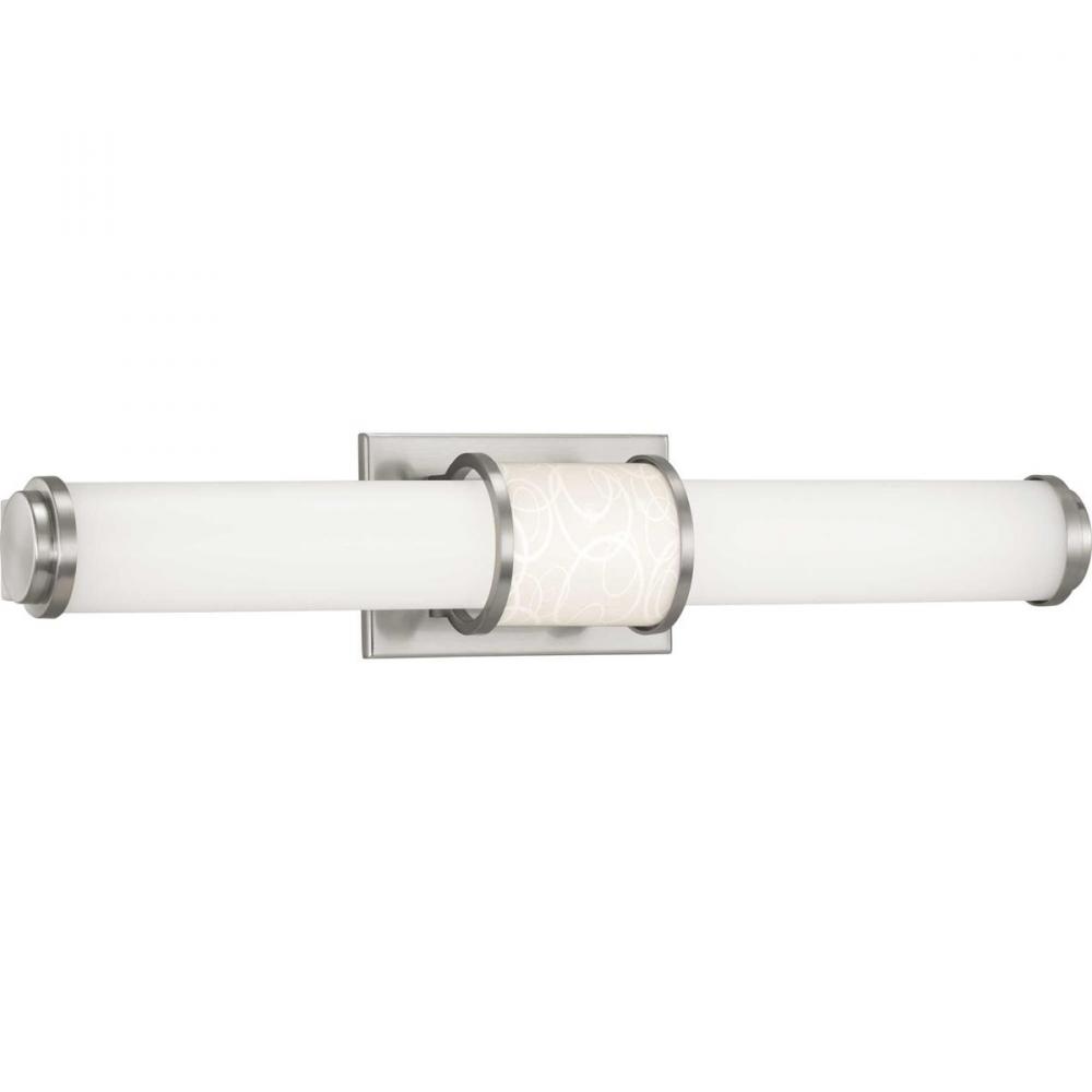 Ideal for a bathroom;Perfect for modern style settings;Beautiful brushed nickel finish;Crisp white acrylic shade;Fixture can mount horizontal and vertical;Includes 1 integrated LED (22 W), 1575 lumens, 3000 K, 90 CRI, dimmable;Measures 24-inch width by 4.