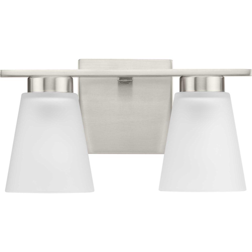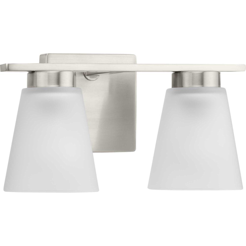 Fill your house with the lively Tanner family of fixtures. Strong lines accent the Brushed Nickel frame in a simple balance of form and function, while soft etched glass shades complement the design. The versatile fixture can be mounted with the shades facing up or down to suit your preference.