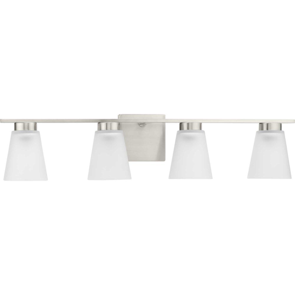 Fill your house with the lively Tanner family of fixtures. Strong lines accent the Brushed Nickel frame in a simple balance of form and function, while soft etched glass shades complement the design. The versatile fixture can be mounted with the shades facing up or down to suit your preference.