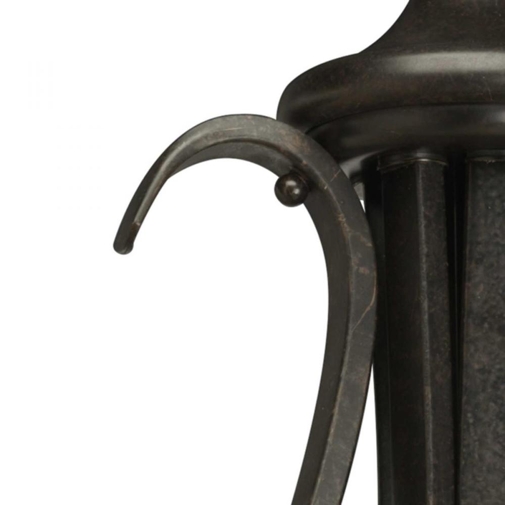Hand painted Forged Bronze finish with black and brown tones.;Bell-shaped tea-stained glass.;Distinctive ebbing and flowing of flat steel arms and scroll accents.;Six feet of 9 gauge chain is supplied for ceiling chain mount.