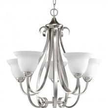 Elegantly formed five-light chandelier featuring soft tea-stained, bell-shaped glass. Distinctive ebbing and flowing of flat steel arms and scroll accents are hand painted in a Forged Bronze finish entailing black and brown tones. With a timeless appeal, this Torino fixture is supplied with six feet of 9 gauge chain for ceiling chain mount.