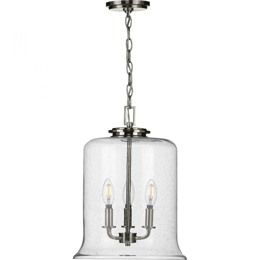 Immerse yourself in a home atmosphere primed for relaxation and inspired thinking with the beautiful craftsmanship of this pendant. Savor this fresh take on a classic light choice as your gaze traces a sleek stem that extends down from a round ceiling plate to a beautiful brushed nickel light base. A lightly seeded glass shade adds an unexpected, but welcomed dash of modern personality to this clean, traditional design.