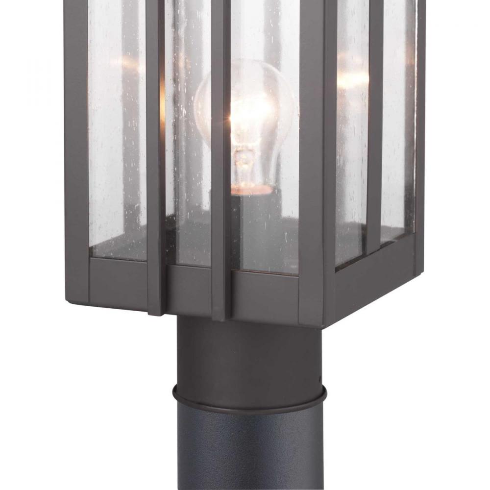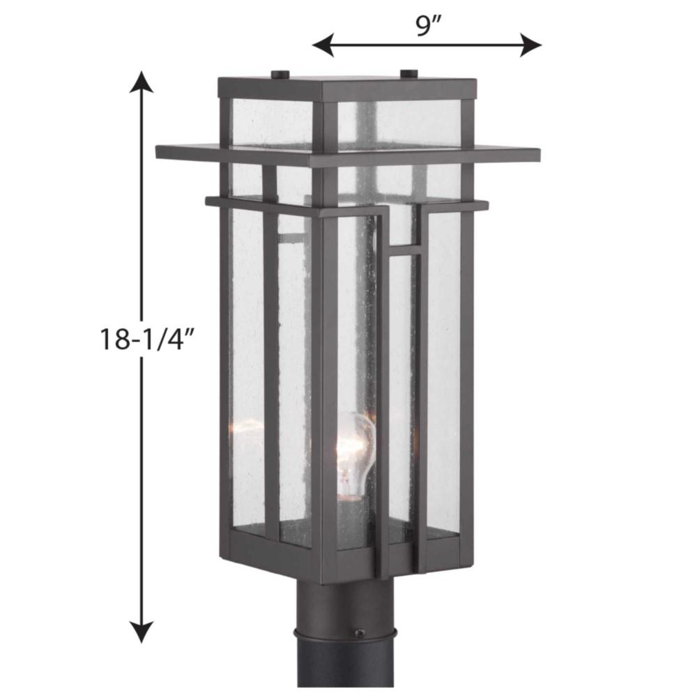 Linear detailing around a clear seeded-glass shade channel Frank Lloyd Wright’s iconic designs;The post lantern makes a distinctive greeting at your home’s front walk;Boxwood’s architectural design is an ideal complement to the Craftsman style;Rich A