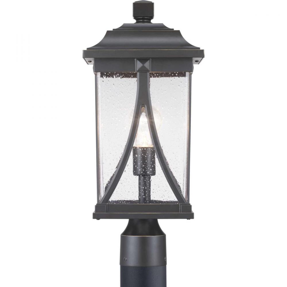 Clear seeded glass, heavy forged details and curving metal accents hearkens back to a Colonial era;The post lantern makes a distinguished greeting at your home’s front walk;The classic lines and sweeping details of the lantern design make it ideal for Tr
