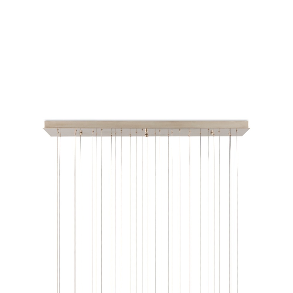 The Pathos 30-Light Multi-Drop Pendant dangles shades that are true works of art. The orbs have been doused in reactive glazes that make their special qualities known in the antique gold on the top and matte charcoal on the bottom, which will look different when illumination flows through them. The beads on the top were melted into the molten glass just before it cooled to bring even more effervescence the design. This is definitely a fixture for anyone who appreciates individual elements made by hand. The canopy of this piece is luminous in a painted silver finish. This fixture is among Currey & Company's multi-drop pendant collection, which includes multiple configurations.