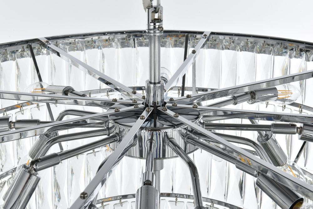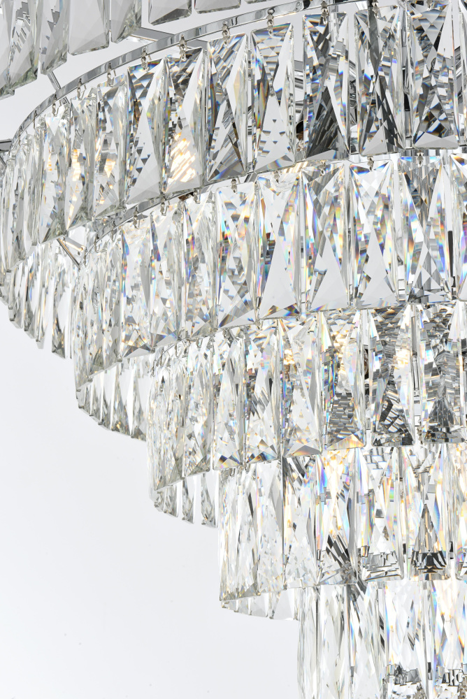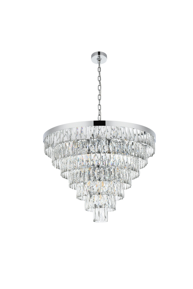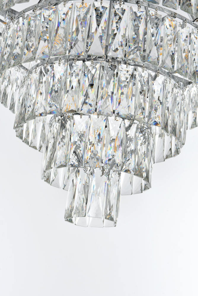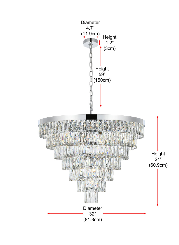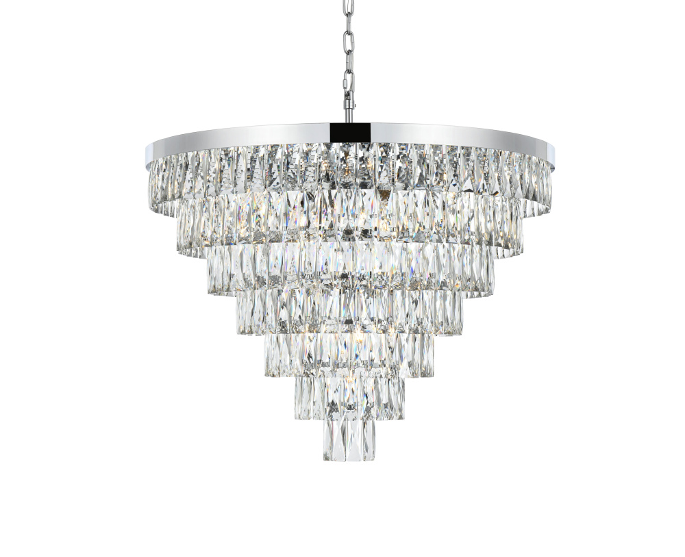 Transform your space with this extraordinary pendant that reimagines classical crystal design for contemporary interiors. The masterfully engineered silhouette features seven graduating tiers that create a spectacular inverted pyramid, reminiscent of a frozen cascade captured in mid-descent. Each precisely cut rectangular crystal is strategically positioned to maximize light play, creating mesmerizing displays of fractured light throughout your space. The substantial scale makes this fixture an ideal centerpiece for grand entryways, sophisticated dining rooms, or executive offices. The thoughtful construction incorporates 25 light sources distributed throughout the tiers, ensuring both spectacular illumination and enchanting crystal animation. The robust iron framework provides a secure foundation while maintaining visual lightness, allowing the crystals to appear as if floating in space. Available in reflective chrome, sophisticated black, or warm satin gold, this pendant makes an unforgettable statement while maintaining refined restraint. The cascading arrangement creates a sense of movement and flow, while the geometric precision of each crystal adds contemporary edge to the classical form. This is more than a light fixture – it's an architectural feature that transforms your space through its commanding presence and spectacular light performanc