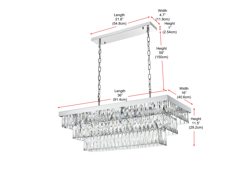 Transform your space with this spectacular linear pendant that reinvents crystal lighting for contemporary interiors. The bold rectangular frame suspends two perfectly proportioned crystal tiers, creating a mesmerizing interplay of light and structure. Each precisely cut crystal is strategically positioned to maximize light play, producing brilliant refractions that dance across your space. The strong horizontal presence makes this fixture an ideal centerpiece above dining tables, conference rooms, or in grand living spaces. The thoughtful construction marries industrial strength with crystalline delicacy, as the robust metal frame appears to float above while supporting the spectacular crystal arrangement. Whether styled in reflective chrome, sophisticated black, or warm satin gold, this pendant commands attention through its architectural presence. The linear composition offers a fresh interpretation of crystal lighting, where clean lines and geometric precision meet the spectacular light performance of premium crystal. This fixture doesn't merely illuminate – it defines space through its commanding horizontal presence while creating an ever-changing display of light and shado