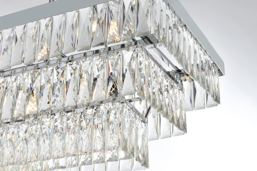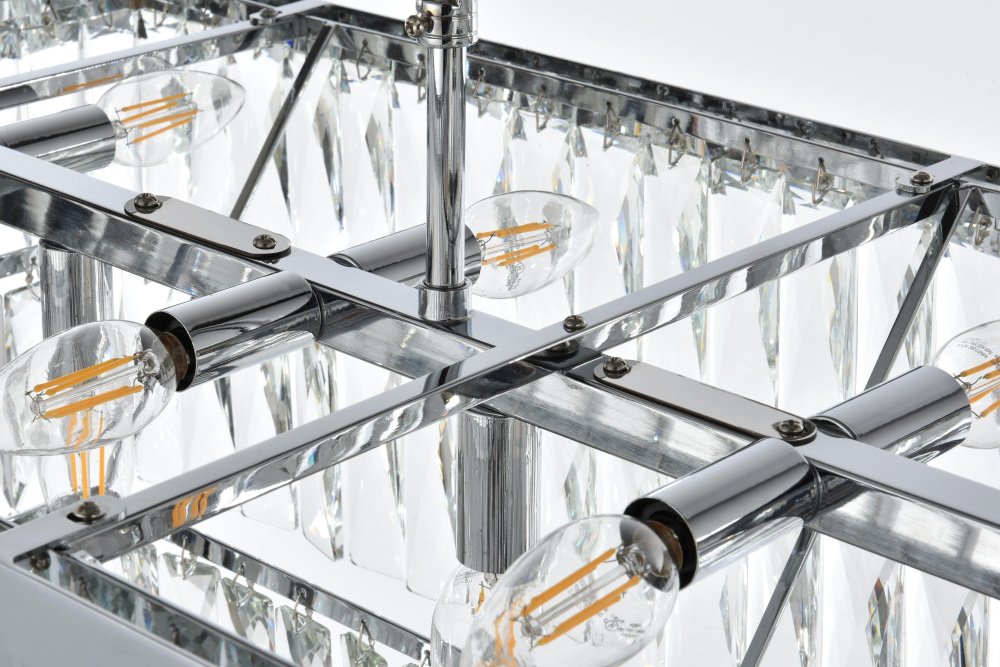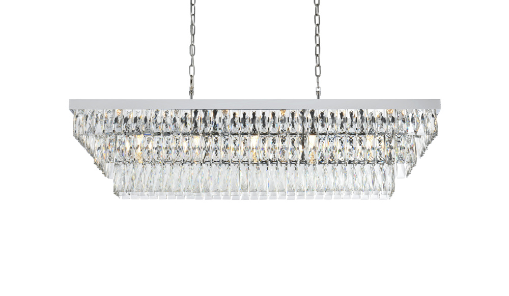 Transform your space with this spectacular linear pendant that reinvents crystal lighting for contemporary interiors. The bold rectangular frame suspends two perfectly proportioned crystal tiers, creating a mesmerizing interplay of light and structure. Each precisely cut crystal is strategically positioned to maximize light play, producing brilliant refractions that dance across your space. The strong horizontal presence makes this fixture an ideal centerpiece above dining tables, conference rooms, or in grand living spaces. The thoughtful construction marries industrial strength with crystalline delicacy, as the robust metal frame appears to float above while supporting the spectacular crystal arrangement. Whether styled in reflective chrome, sophisticated black, or warm satin gold, this pendant commands attention through its architectural presence. The linear composition offers a fresh interpretation of crystal lighting, where clean lines and geometric precision meet the spectacular light performance of premium crystal. This fixture doesn't merely illuminate – it defines space through its commanding horizontal presence while creating an ever-changing display of light and shado