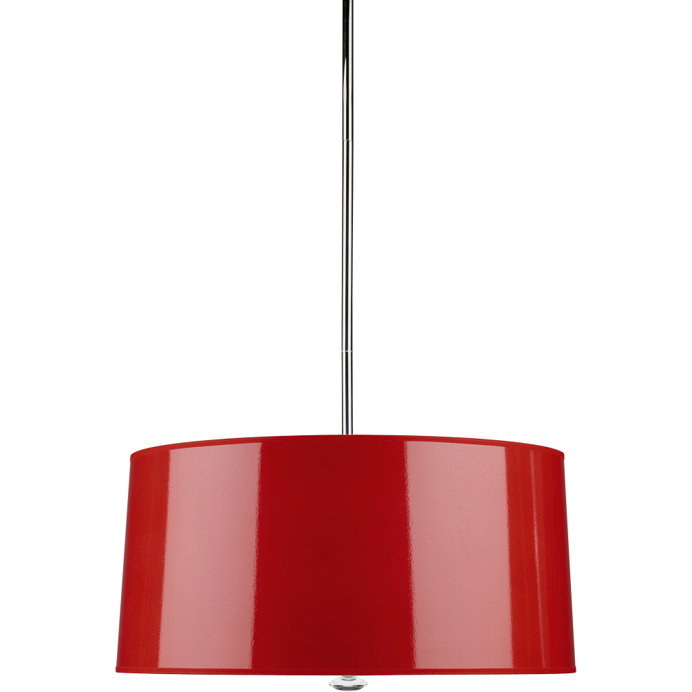 The Penelope collection draws the eye by combining polished metal, vibrant color choices, and graceful tapers. These pieces are sure to add both sophistication and visual appeal to your space. - Polished Nickel Penelope Pendant with Red Ceramik Parchment Shade with Silver Mylar Lining