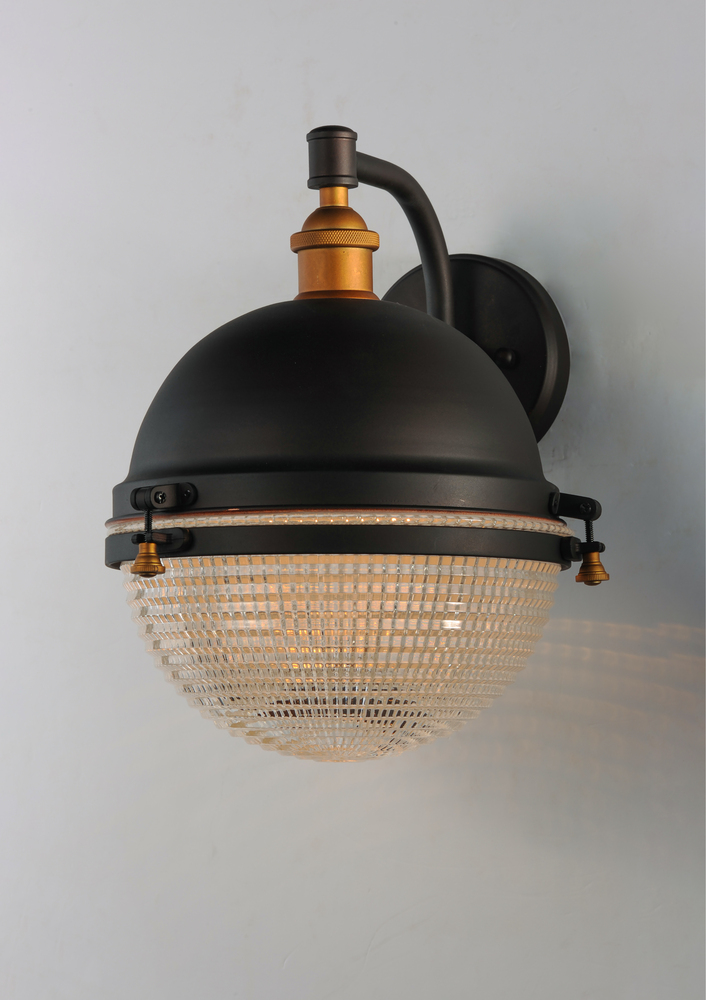 This nautical design features a solid dome of aluminum finished in Oil Rubbed Bronze with solid brass hardware finished in Antique Brass. The Clear prismatic glass diffuser completes the authentic look of this outdoor collection.