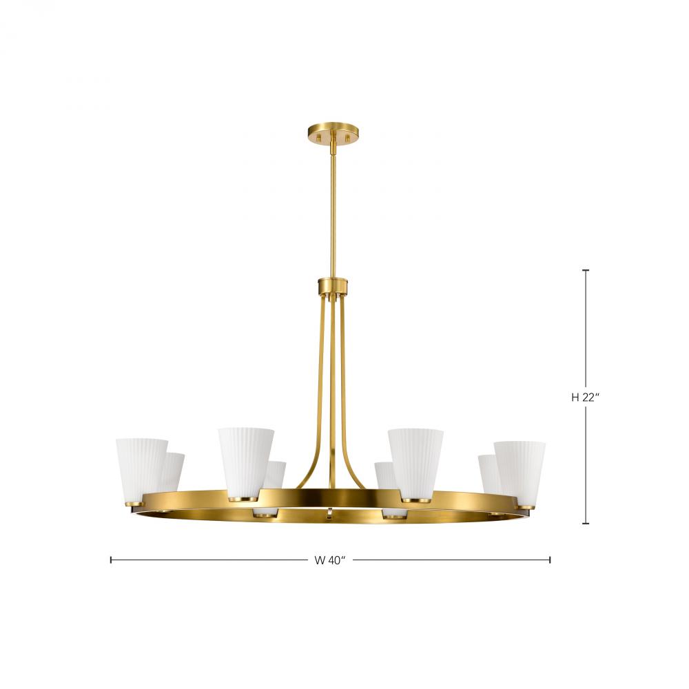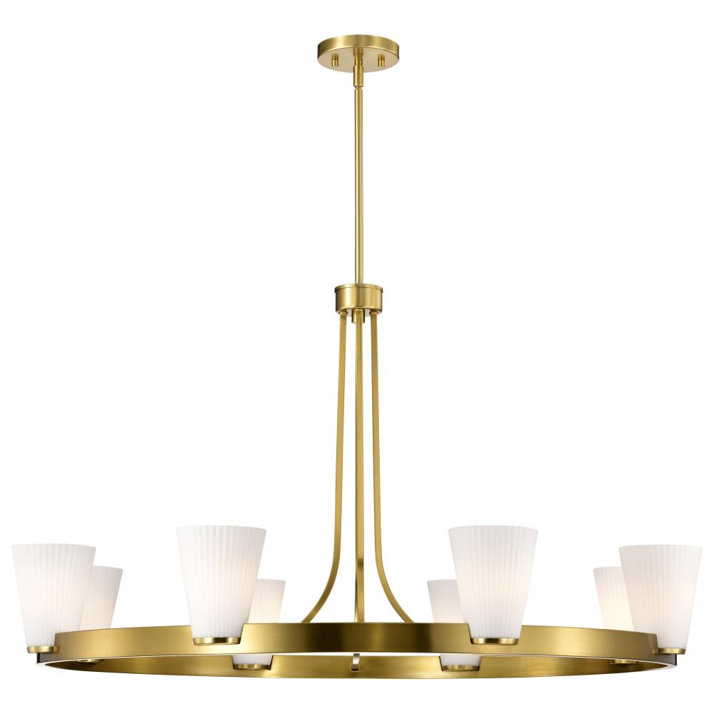 Indulge in the glamour of the Royale 60-8729 eight light chandelier, where sleek Art Deco silhouettes meet modern refinement. The satin white pleated glass adds texture and sophistication, diffusing light with a soft, radiant glow. Finished in burnished br