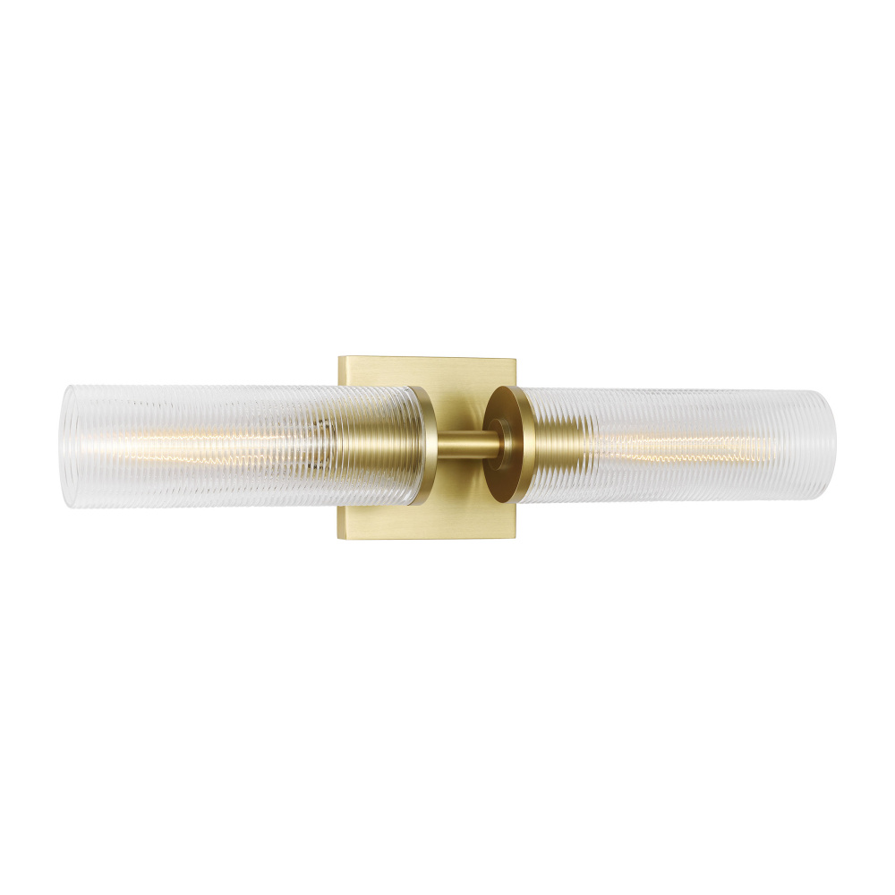 Crafted with Steel in a Satin Brass finish with clear ribbed glass shades