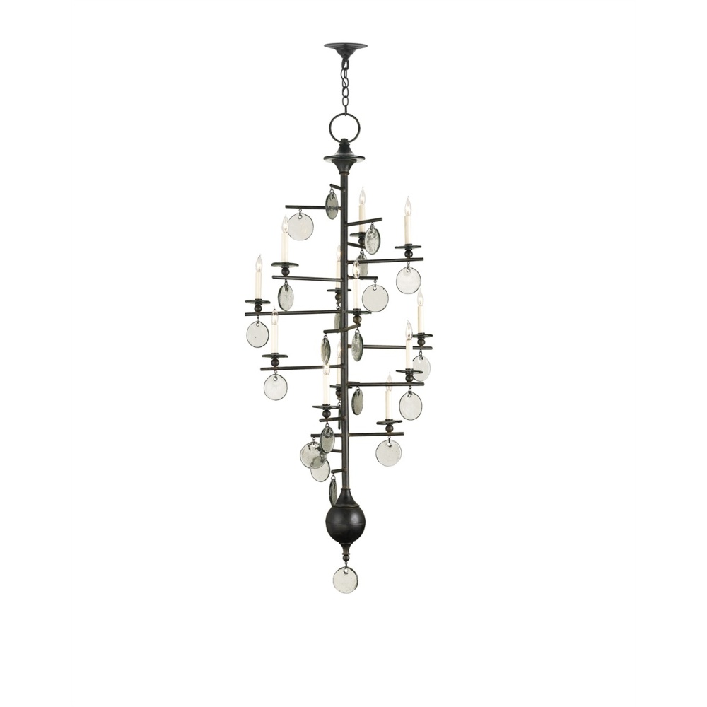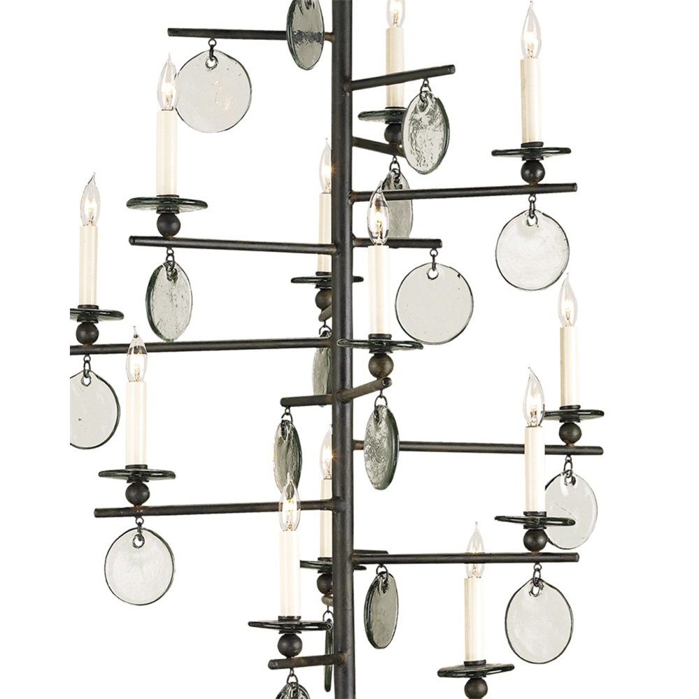 This is a very tall version of the Sethos Chandelier with its recycled glass discs and wrought iron framework that will look commanding in tall narrow spaces. The linear wrought iron frame has been treated to an old iron finish to give the design heft, while the discs of recycled glass dangling from the arms of the 12-light fixture glint when light pierces them. The unusual appearance of this chandelier will appeal to those who have grown weary of the ubiquitous candelabra.