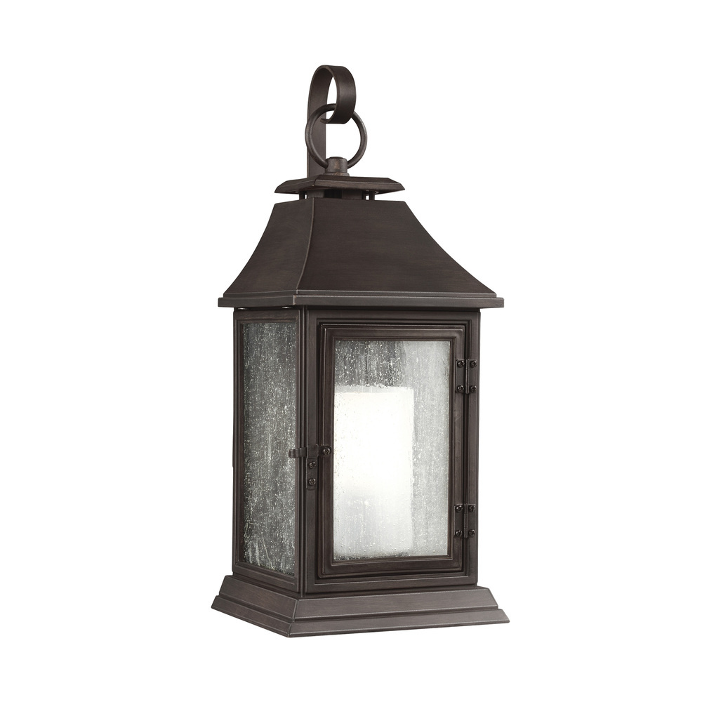 Inspired by traditional Parisian style lanterns, the Shepherd outdoor lighting collection by features a decorative shepherd's crook, a latched and hinged front door panel, an inner Case White glass shade, Clear Seeded outer glass to create the visual appearance of vintage gas lanterns. Made of a proprietary composition for outstanding durability even in the harshest elements, the collection has a 5-year warranty. Offered in either Dark Weathered Zinc or Heritage Copper finishes.