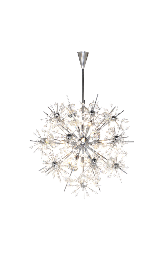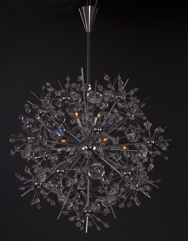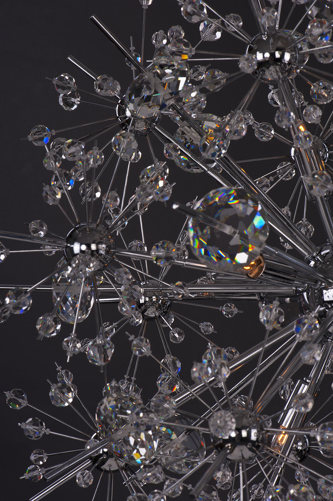 Spectacular display of Beveled Crystal beads of various sizes which are mounted on sculptures Polished Chrome metal formations which will sure to be the focal point of your room. The high power Xenon bulbs add sparkle to the crystal while producing a natu