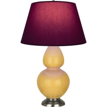 Sunset Glazed Ceramic with Antique Silver Finished Accents Double Gourd Table Lamp with Bright Blue Fabric Shade with Gray Lining - Our Double Gourd collection features a simple but gracefully curving silhouette. Available in a wide array of vibrant colors and several different base finishes.