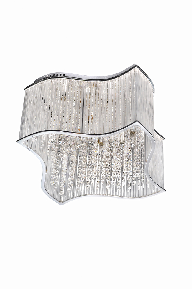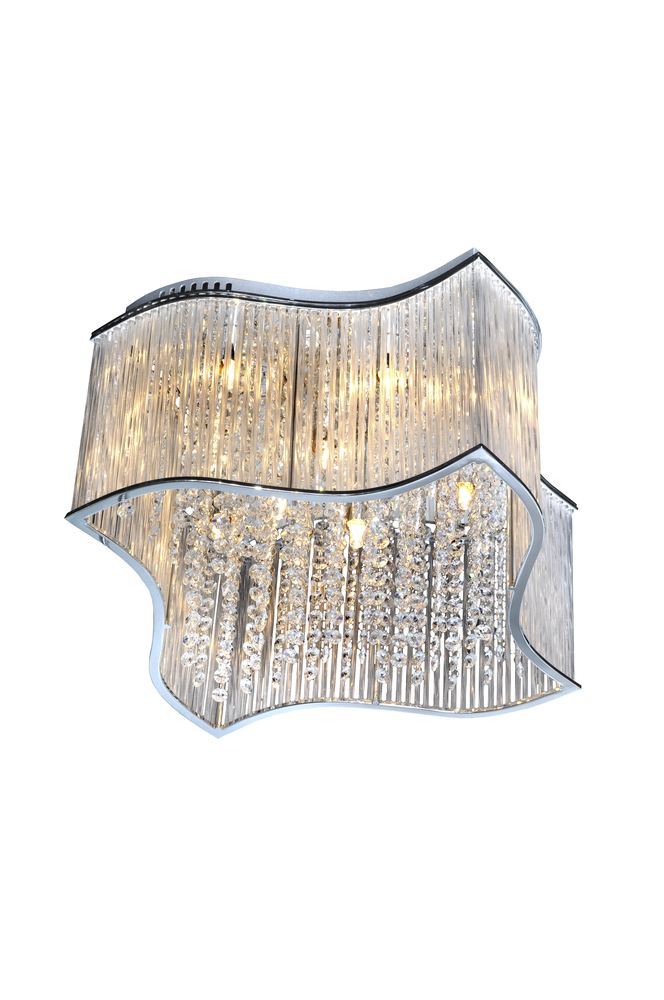 Swizzle collection's gently curved frames of Polished Chrome support twisted Clear glass rods that shimmer in front of the natural light of the included xenon lamps. The interior of the fixture is draped with strands of clear beveled crystal that spark