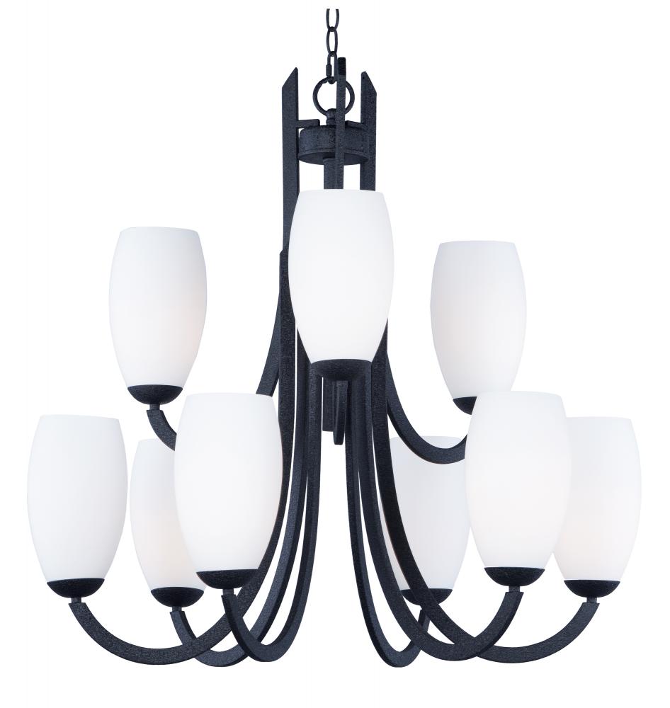 Heavy rectangular tubing support tall scale Satin White glass shades that creates an upscale forged look at a builder price. Available in your choice of Textured Black or Satin Nickel, this collection is complete enough to do the entire home.