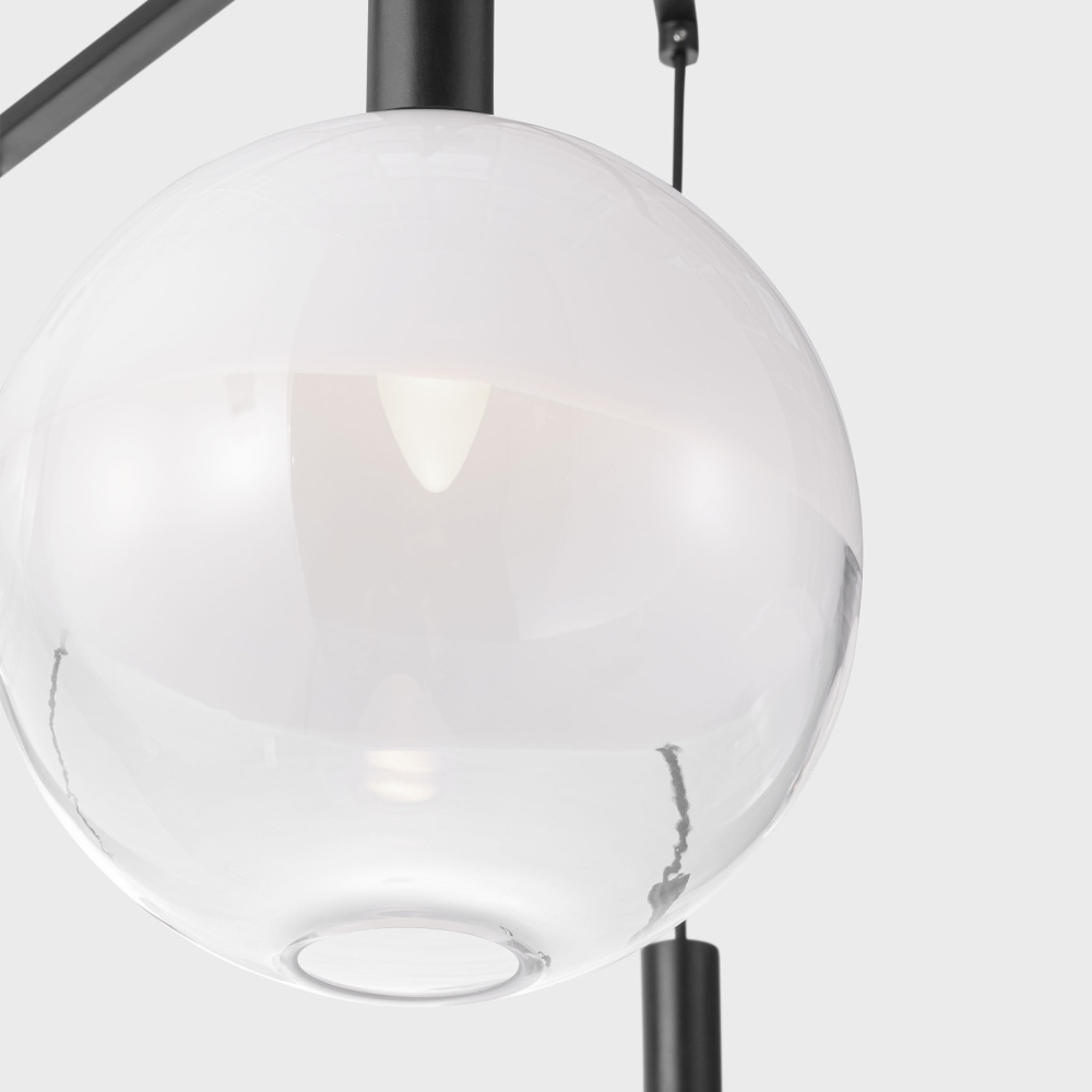 The Torian collection by Sean Lavin draws inspiration from sculptural hanging mobiles. Multiple arms with fabric cords suspend beautiful glass globe shades with an ombre effect, transitioning from milk to etched clear glass. Ideal for entryways and dining rooms, the Torian chandelier will lend a sophisticated artistic touch to interior spaces.