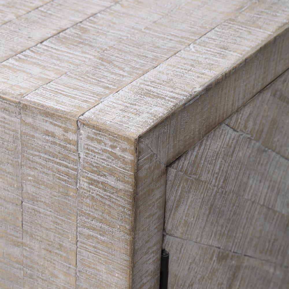 This Modern Farmhouse Two Door Cabinet Features Linear Textured Fir Wood, Finished in A White Washed Glaze with Oatmeal Undertones. Antique Bronze Iron Door Pulls Open to One Fixed Shelf.