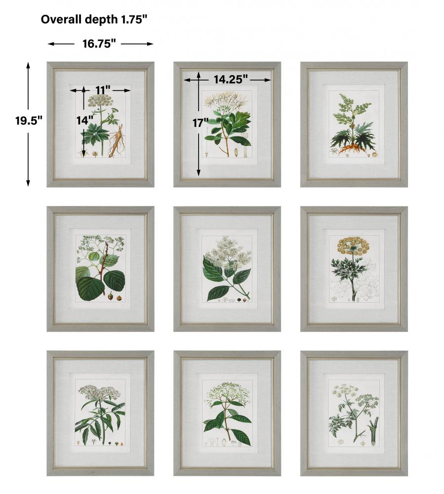 This Set of Nine Botanical Prints Were Originally Created By French Botanist and Illustrator Pierre Turpin in The Early 19th Century. Each Work of Art is Accented By An Oatmeal Linen Wrapped Mat and A Light Gray Wood Tone Frame with A Petite Champagne Liner. Prints Are Under Glass.