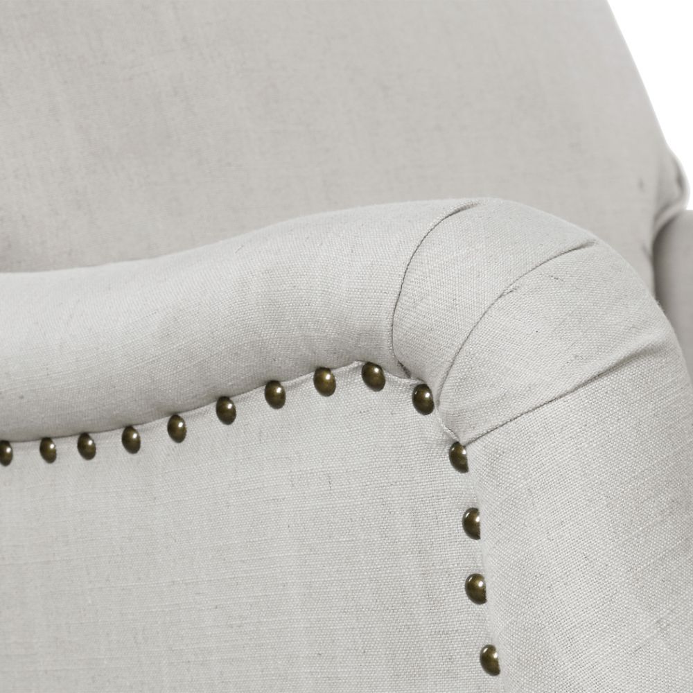 Classic Antique White English Arm Chair with Loose Box Cushions, Antique Brass Nail Head Trim and Hand Turned Legs in Distressed Honey Stain. Seat Height is 19".