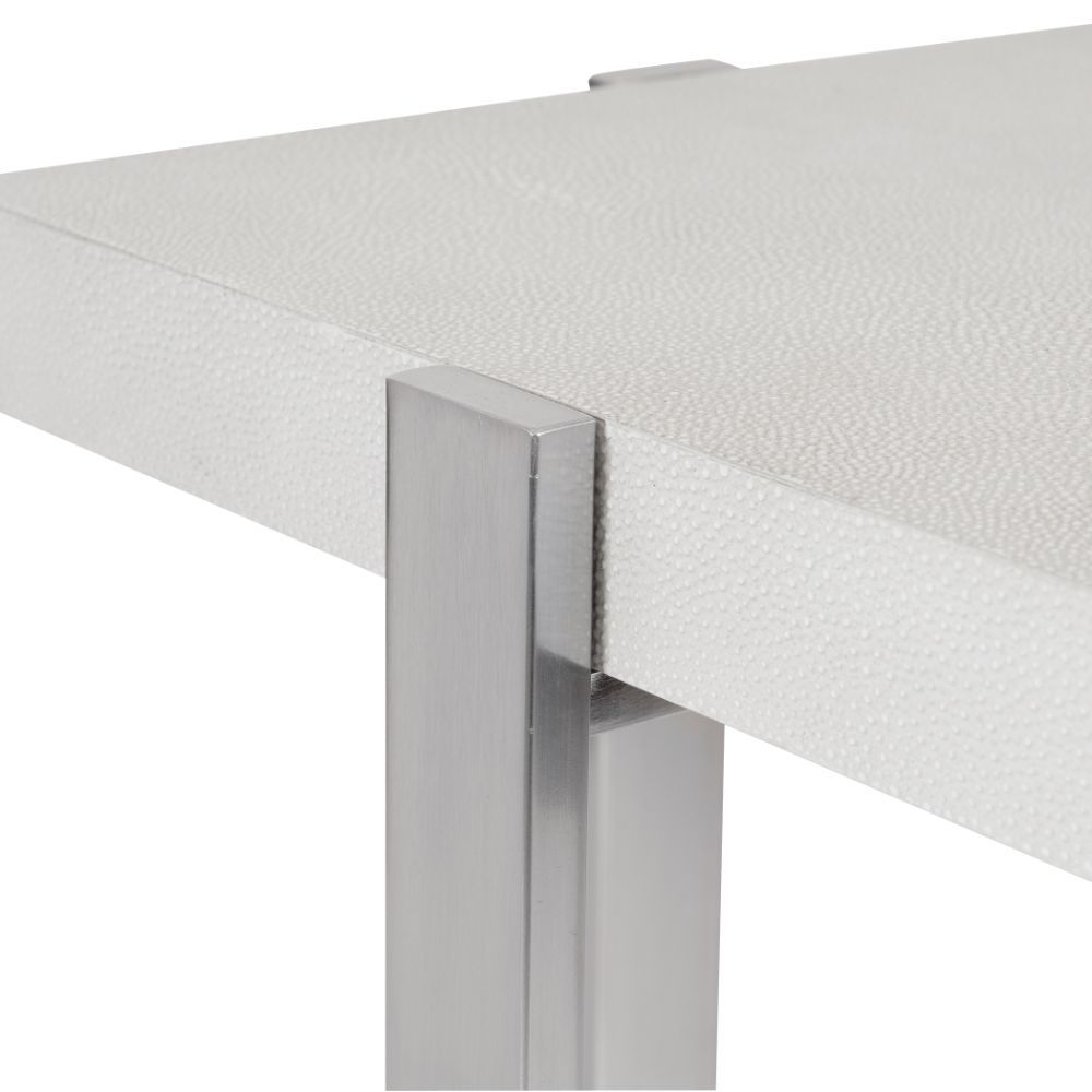 This Clean Contemporary Accent Table Features Crisp Layers of Faux Shagreen Shelves in Milk White with A Light Gray Glaze, Secured By Steel Supports in A Plated Brushed Silver Finish.