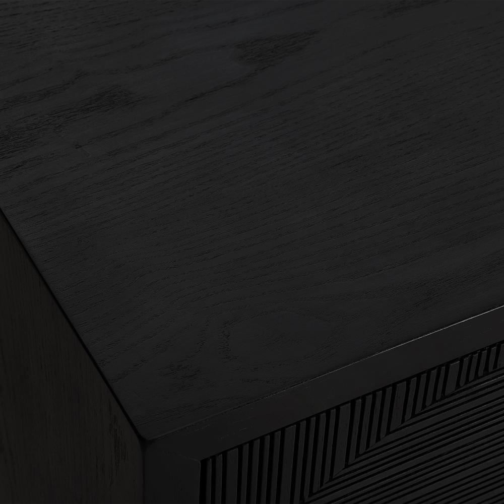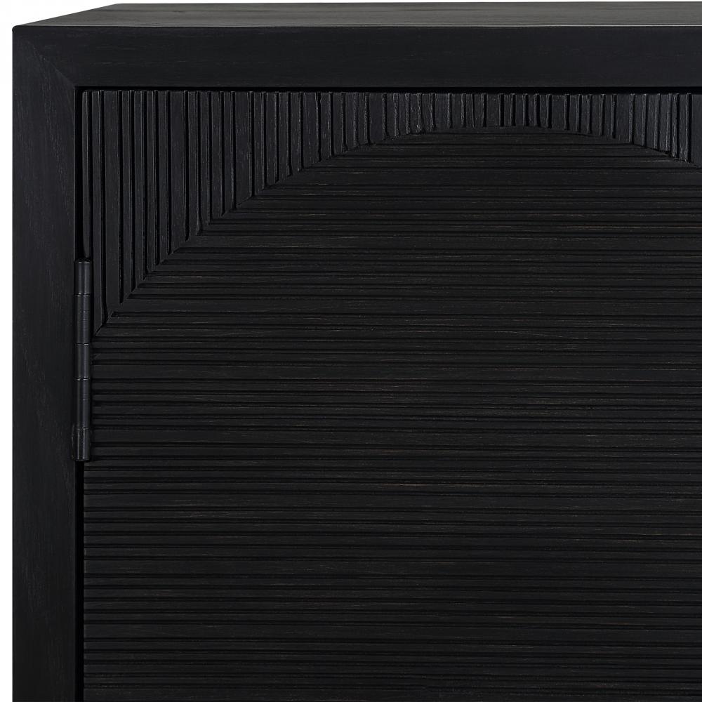 This Cabinet Features A Stylish Carved Circle Pattern In A Chic Black Matte Finish, Giving The Cabinet An Unique Elegance. Push To Open Doors, Oak Grain, And A Thin Raised Metal Base Complete This Contemporary Look.