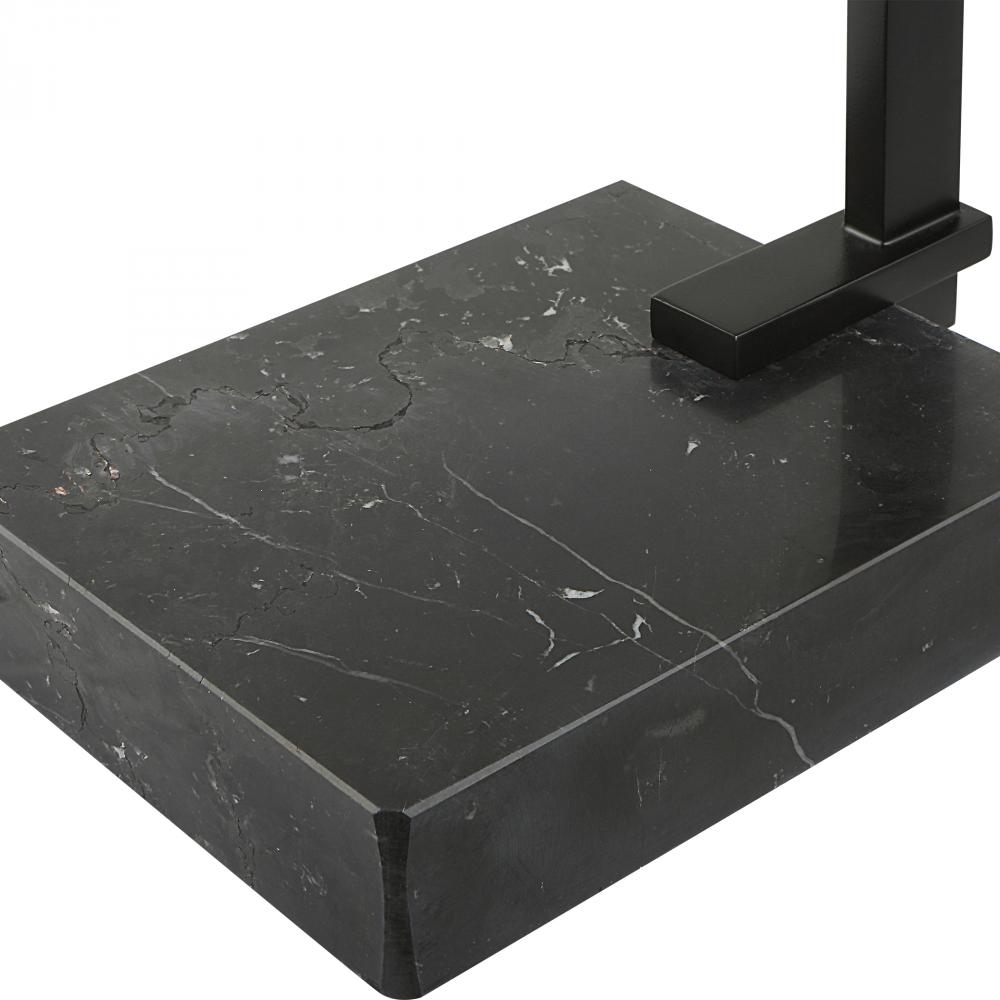 This Perfect Pull-up Table Pairs A Classic Design with Modern Finishes. The Tempered Glass Top is Supported By A Satin Black Plated Stainless Steel Base Accented By A Honed Black Marble Foot with Natural Veining and Character.