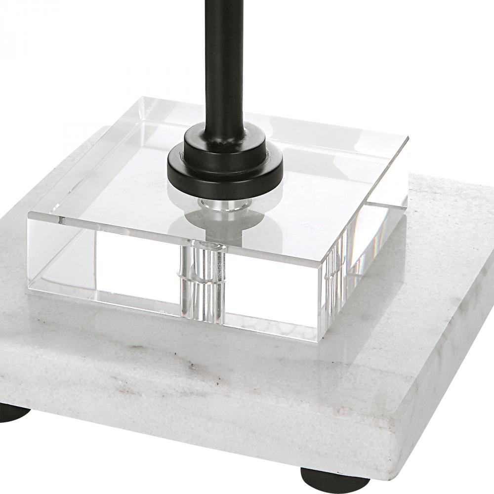 Sleek and Simple, This Buffet Lamps Features A Satin Black Metal Base Pearched on A Crystal Slab and A White Marble Foot with Subtle Veining. The Round Hardback Shade is Wrapped in A White Linen Fabric.
