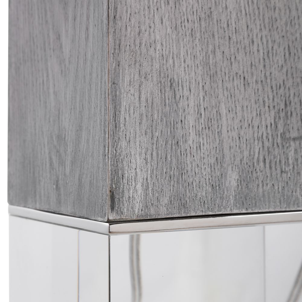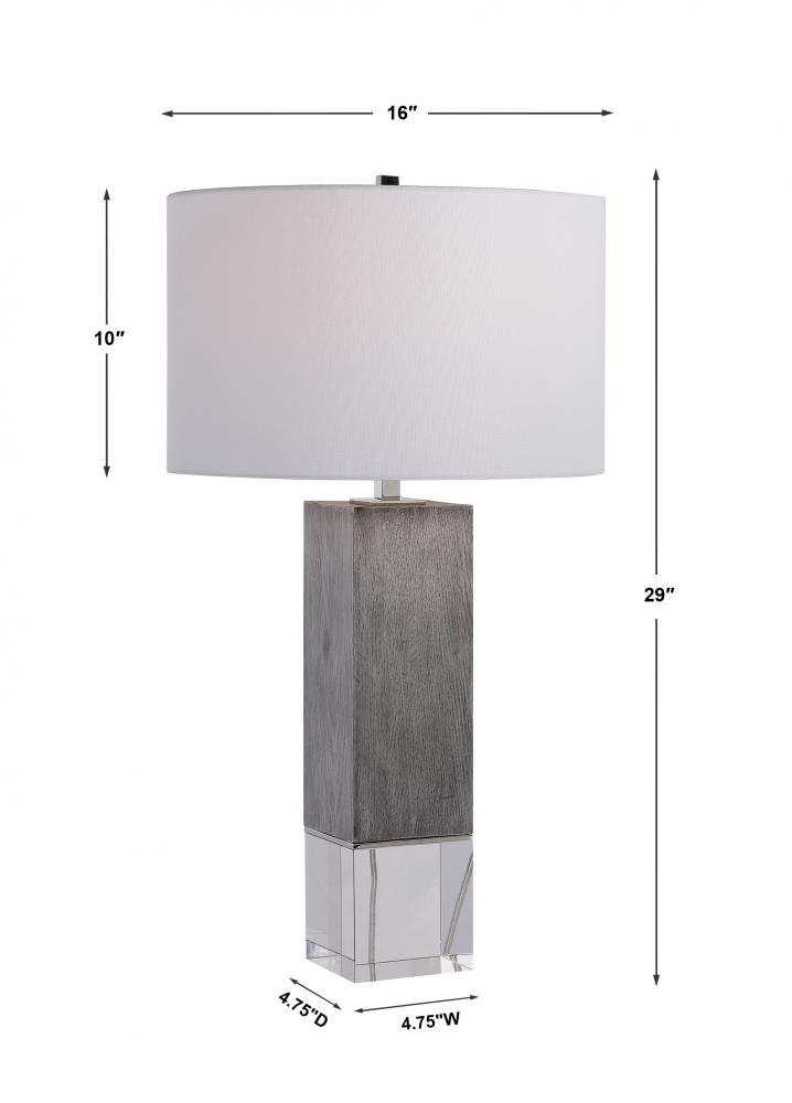 Inspired By Modern Lodge Style, This Table Lamp Features A Light Gray Oak Look, Accented By Polished Nickel Plated Details and A Crystal Foot That Elevate The Sophisticated Design. The Lamp is Paired with A White Hardback Drum Shade.