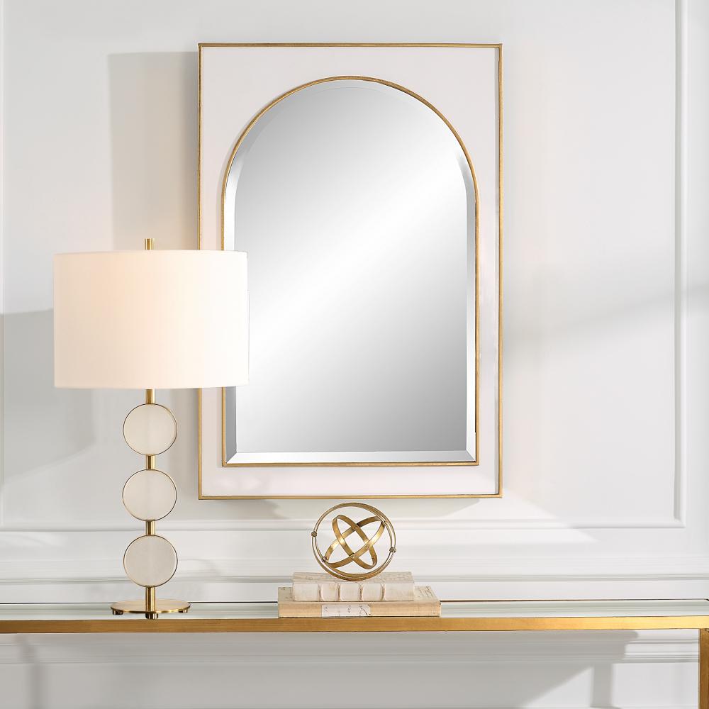 This Iron Mirror Showcases A Gloss White Finish Surrounding The Classic Arch Shape, Accented with Raised Edges Finished in A Lightly Antiqued Gold Leaf. The Mirror Has A 1" Bevel.