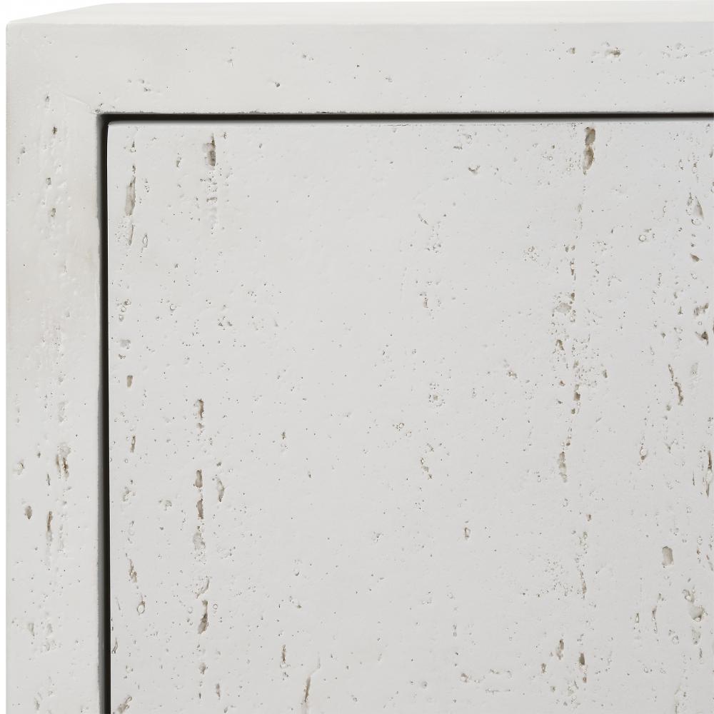 A Stylish Two Door Cabinet Crafted From Cast Resin. Emma Features A Porous Textured Surface For An Organic Look And A Tactile Perception. Glowing Hardware In Antique Gold Iron Has A Concave Shape With Mottled Texturing. A Slate Blue Interior Offers A Fun Surprise With Two Adjustable Shelves.